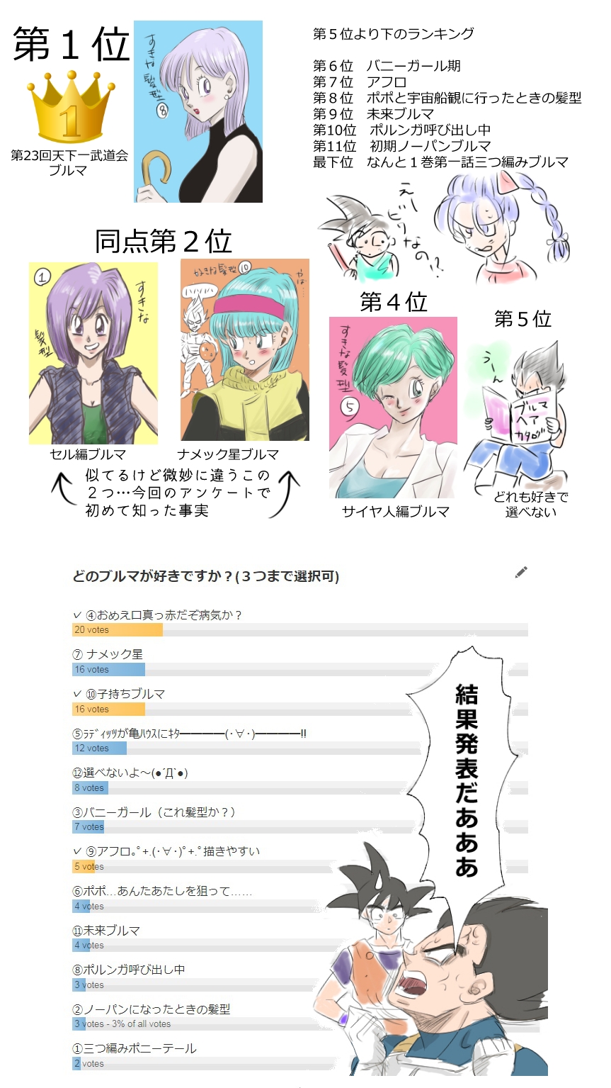 普段なんとも思ってなかった23回天下一武道会の髪型がトップ…確かにこの絵が一番自分でも魅力的なブルマに描けたな…って。