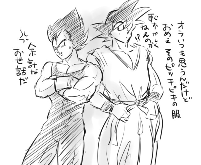2人とも「服のセンス悪いな」と思ってる、という妄想。悟空に至ってはセンスがどうとかより「ベジータってヘンテコな恰好してんな~」程度だろうけど。「あいつのチンコどうなってんだ??」とかw