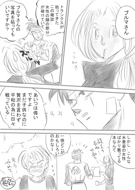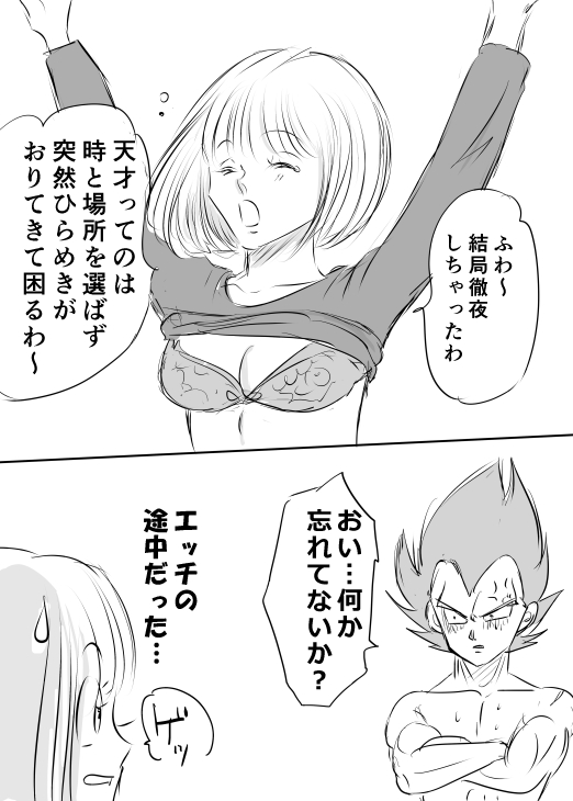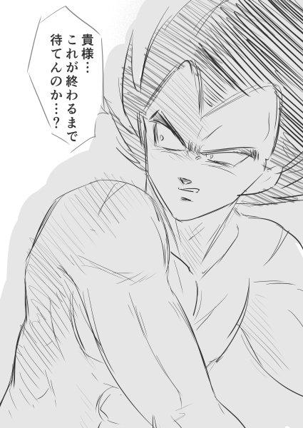 ということでこの絵は一晩待っていた王子でした。何かを造ってるブルマの背中を寂しく眺めていた…。襲えよ、襲っちゃえよ!!!でも研究に没頭するブルマがまた…いいんだな、とか無意識に思って興奮してる。健気だ。