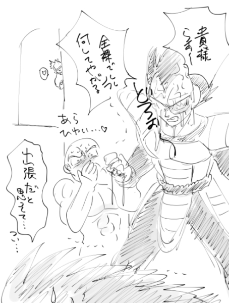 飛距離を競わせようとしたけど、基地内じゃ無理があるので、ため込んだザー●ンの量を競うナッパとラディッツであった。尻尾描き忘れてしまって…ガチムチハゲ親父と挑発デコマッチョのおっさん2人が全裸になってるだけの…なんとも言えない絵になった。